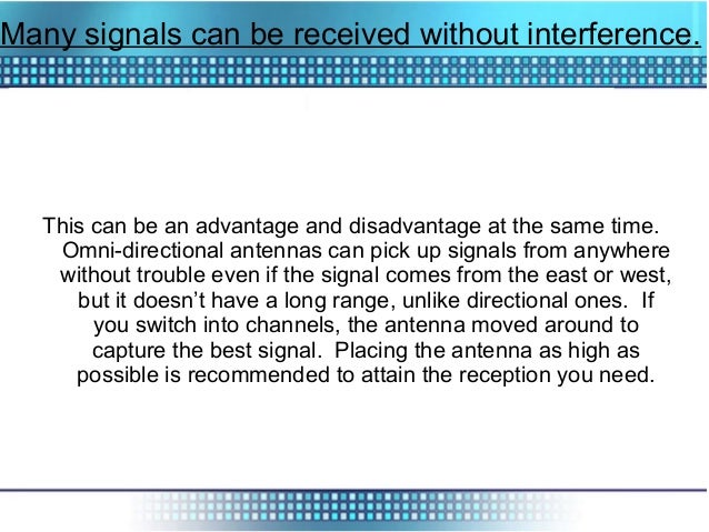 Zone 1 always faces east. Pros and cons of purchasing an omni directional antenna 1. It is often recommended to research the advantages and the disadvantages of using directional antennas in a particular situation and environment before making the purchase. A directional antenna receives or sends more signal from or to the front than the sides or back.