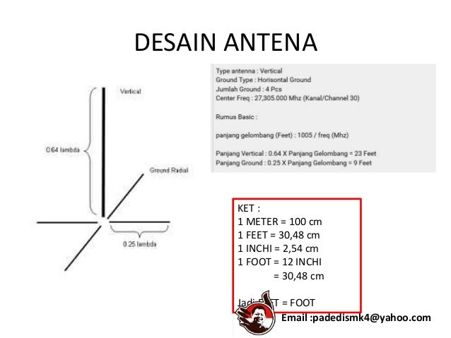 Yaang di maksud sebagai acuan adalah tujuan untuk mendapatkan parameter parameter antena tertentu yang didasarkan pada formula formula matematis di setiap dimensi elemen antena. Antena jenis ini digunakan untuk frekuensi tinggi yaitu 2 meteran antena ini langsung dihubungkan dengan kabel 50 ohm dean tanpa rangkaian matcher penala antena. Panjang masing masing ground plane lambda antena semacam ini disebut antena ground plane periksa gambar 13 a. Lamda t 300 fx0 95 atau 0 965 atau 0 99.
